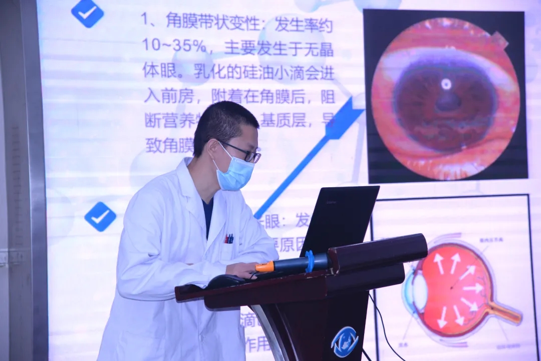 江毅主任分享了两例浅前房病例:一例为外伤致引流阀断裂导致前房消失,眼压增高;一例为新生血管性青光眼、硅油眼,引流阀植入术后前房消失,眼压增高;大家各抒己见,分析浅前房原因,手术处理技巧及预防措施。