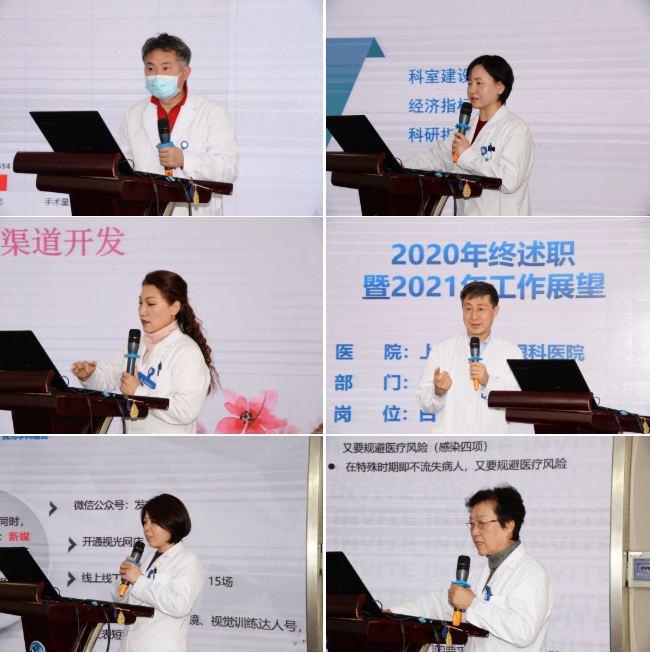 会上,眼综合、眼底病专科、屈光专科、白内障专科,视光专科和医务部主任分别汇报了各部门一年来各项工作的亮点、重点及缺陷,并对2021年度工作计划进行了部署,做到方向明确,职责清晰。